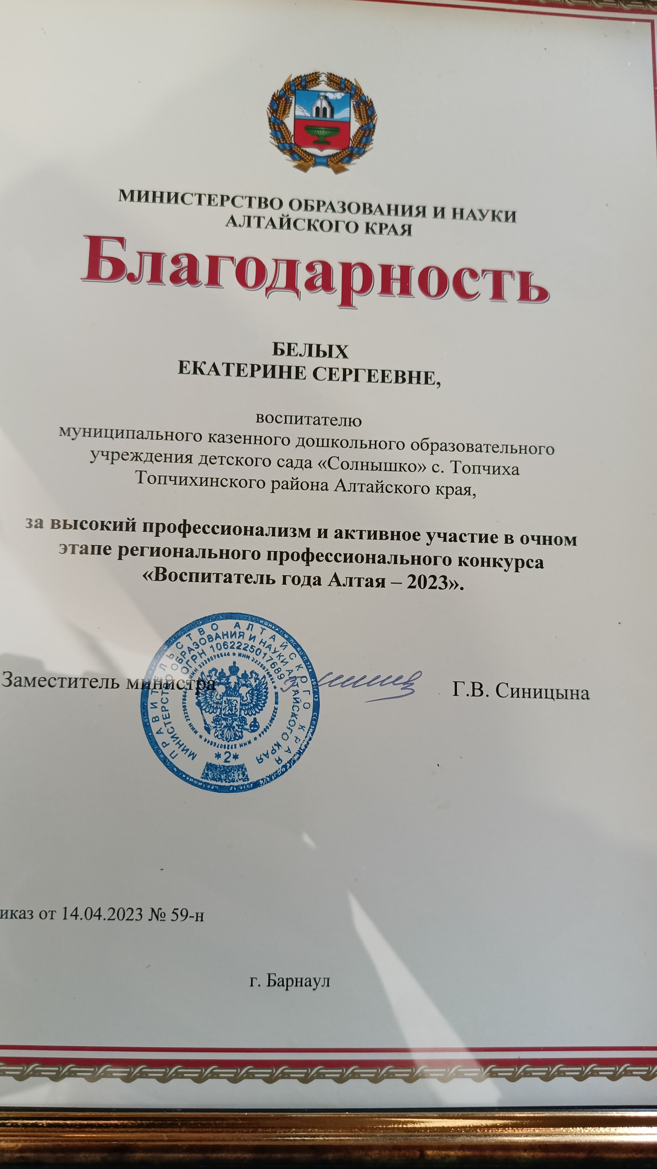 Благодарность за участие в очном этапе регионального профессионального конкурса "Воспитатель года Алтая-2023"